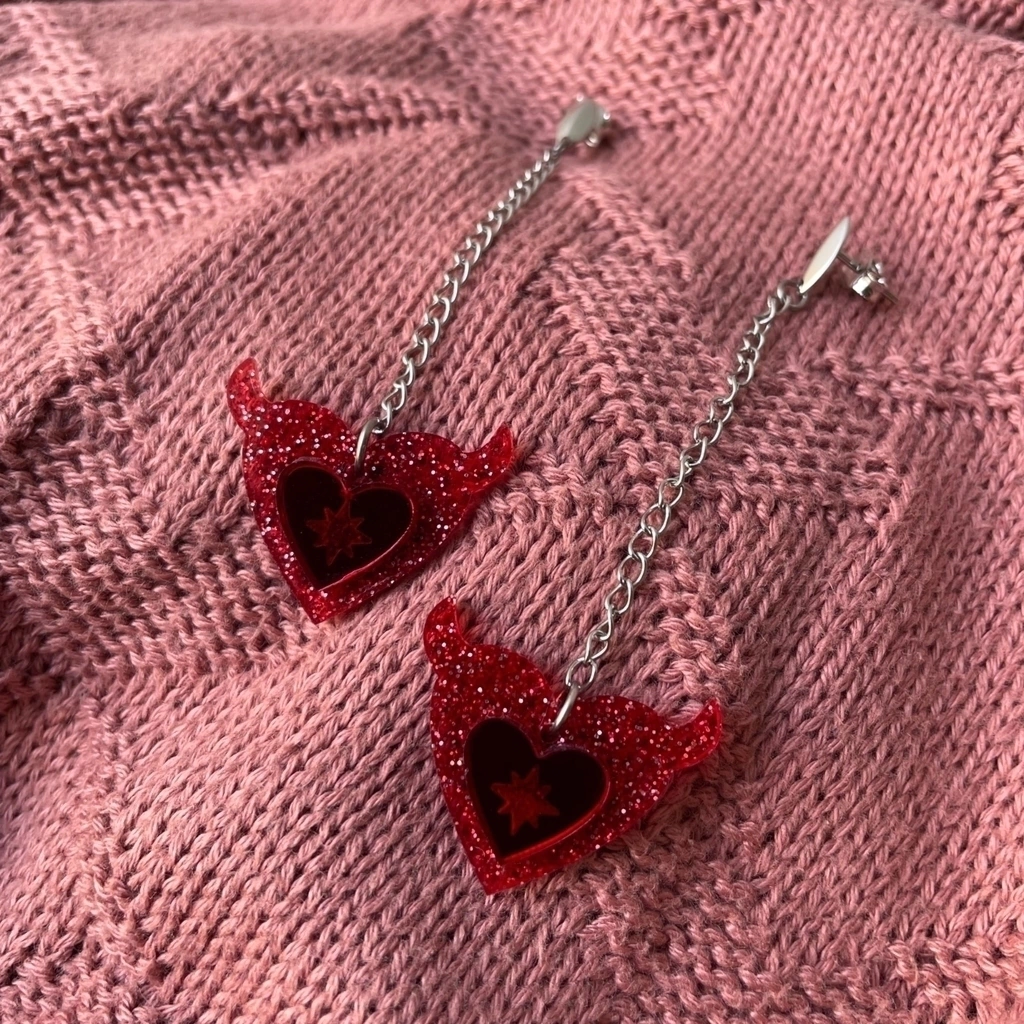 Divertido e com caimento maravilhoso, este é o brinco Elvira. Feito em acrílico purpurina vermelho levemente transparente, e corações sobrepostos em acrílico espelhado dos dois lados, permitindo que o brinco gire e mantenha o desenho nas duas faces.