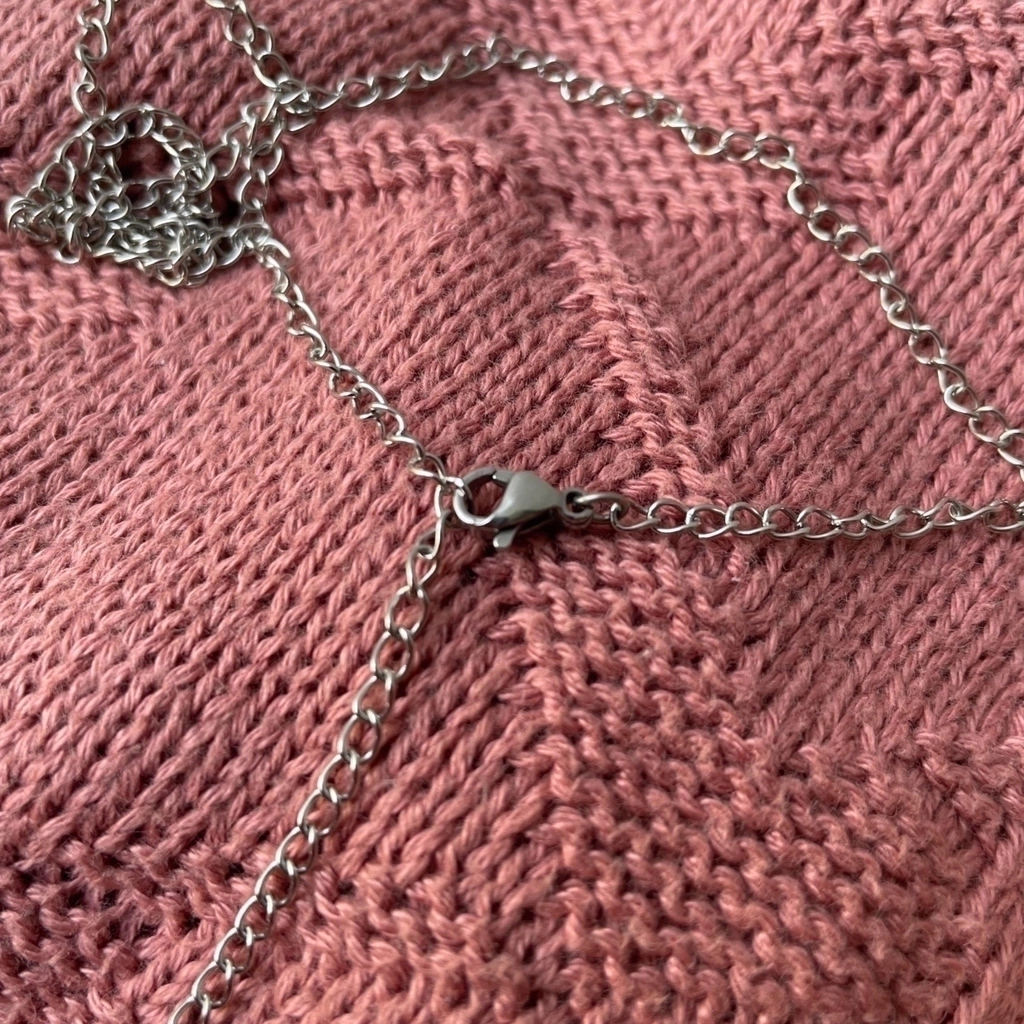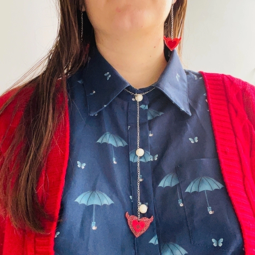 Colar Elvira que pode ser usado convencional ou como uma choker com pingente pendurado. Feito em acrílico purpurina vermelho levemente transparente, e corações sobrepostos em acrílico espelhado dos dois lados, permitindo que o colar gire e mantenha o desenho nas duas faces.