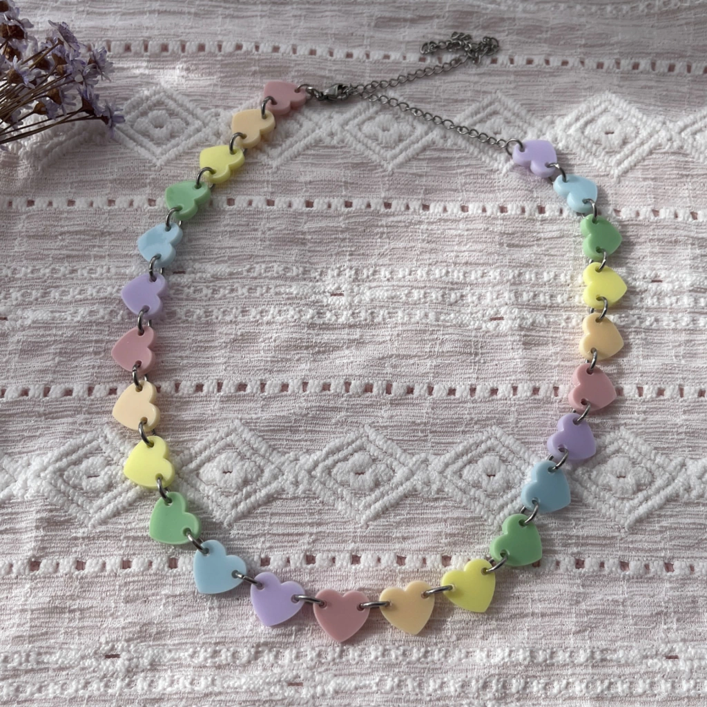 Gargantilha Love Candy em formato de corações. Pode ser usada mais curta e justa, como uma choker, ou maior, em formato colar curto. Feito em acrílico liso e todas as ferragens em aço inox.