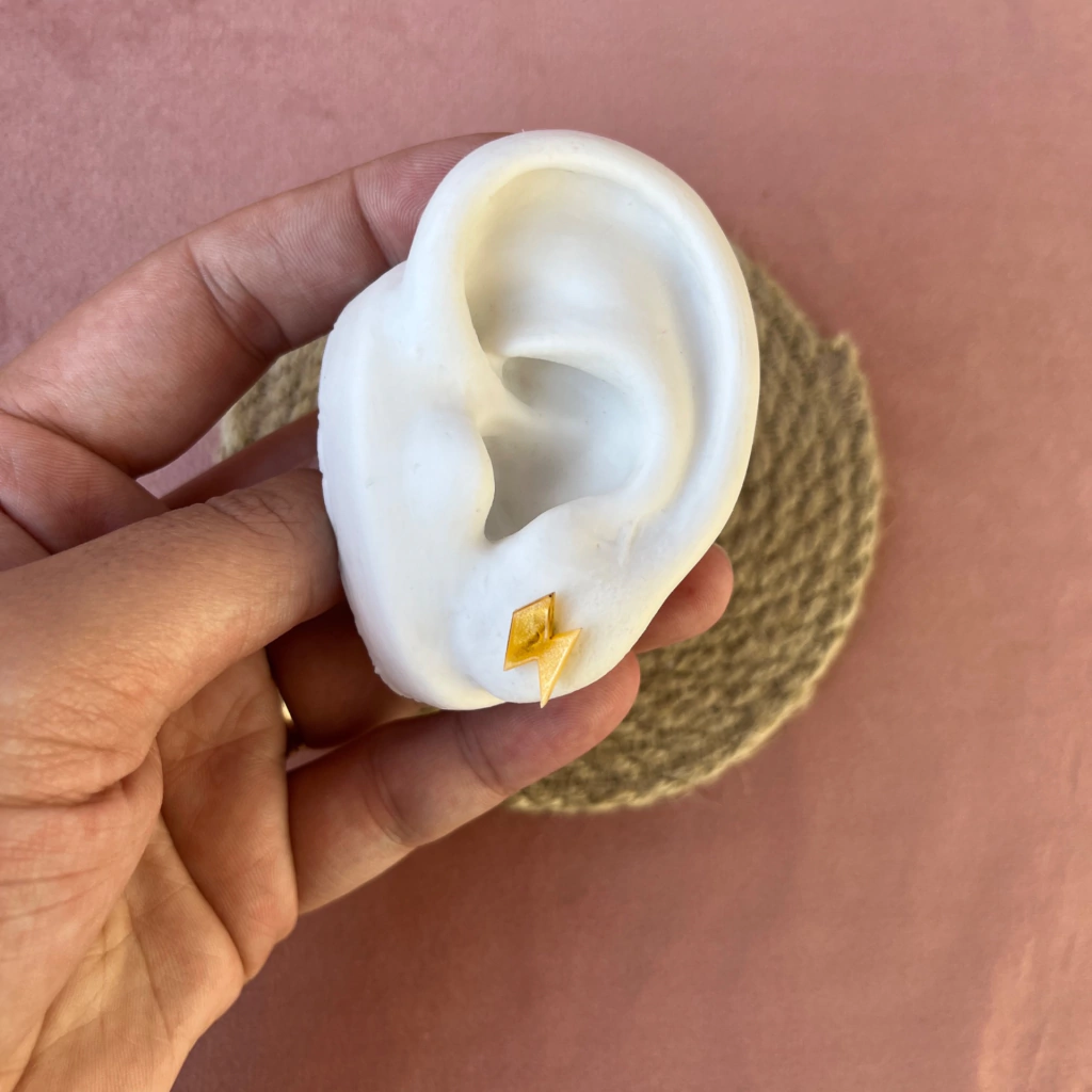 Kit acompanha 3 pares dos formatos: Flor (Fúcsia perolado), raio (amarelo perolado) e coração (azul perolado)